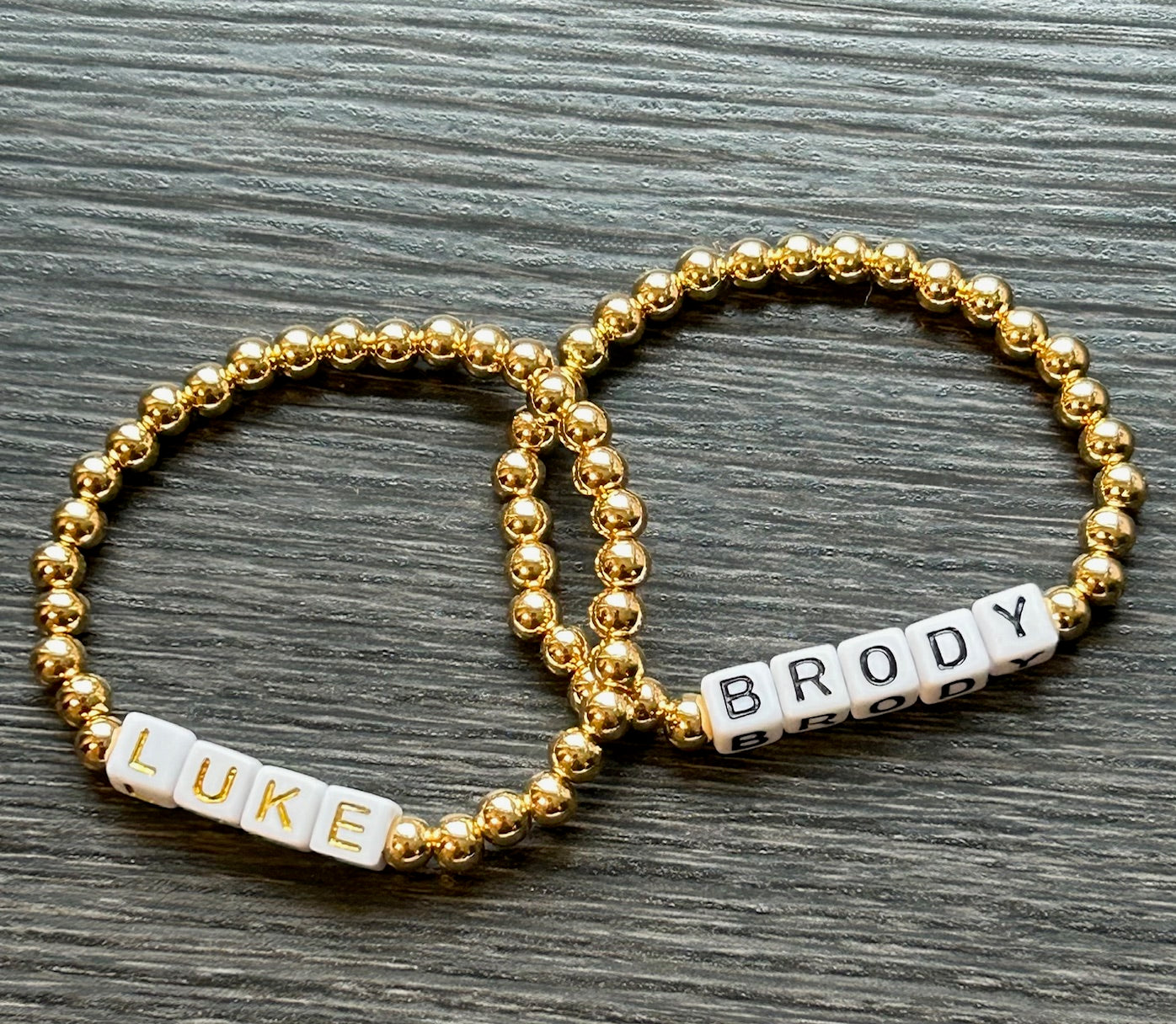 Add a touch of glitz and glamour to your style with our Gold Name bracelet! Personalize your look with your own name, stamped in shining gold or black lettering. Perfect for a playful and trendy addition to any outfit. (P.S. Makes a great gift!)
