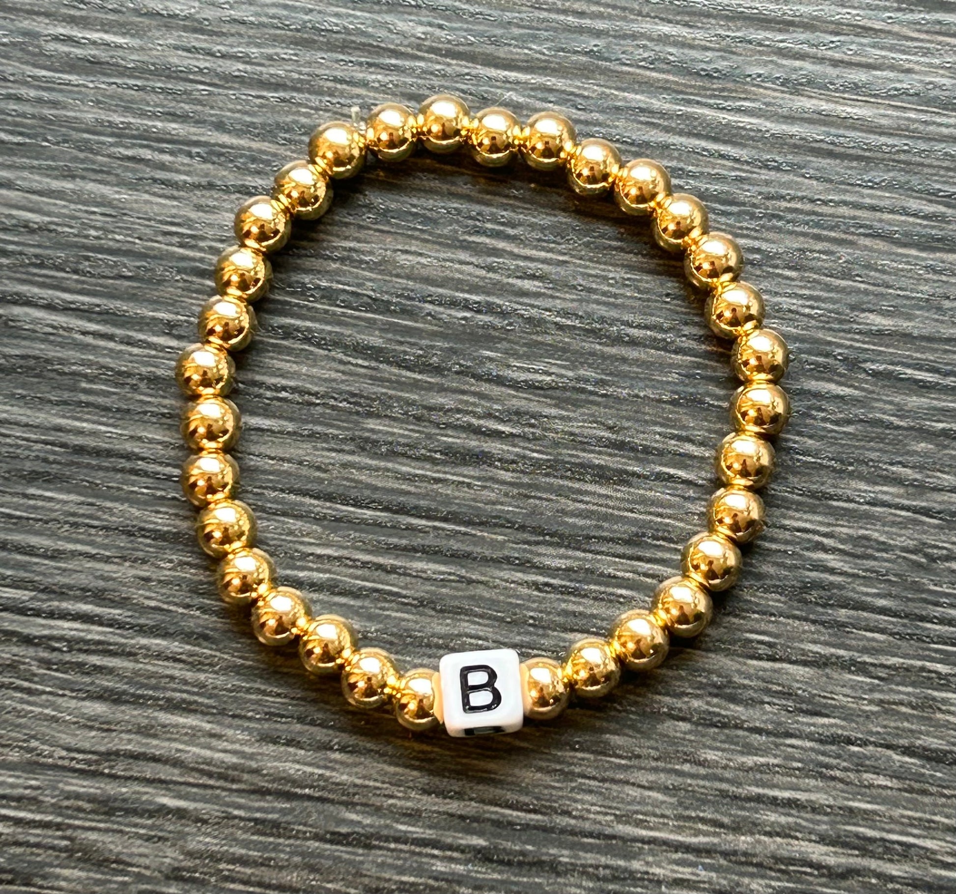 Add some personal style to your look with our Gold Initial bracelet. Made with a 5mm Gold filled beads, this bracelet is a perfect way to express yourself. Great for everyday wear or as a special gift for a loved one.