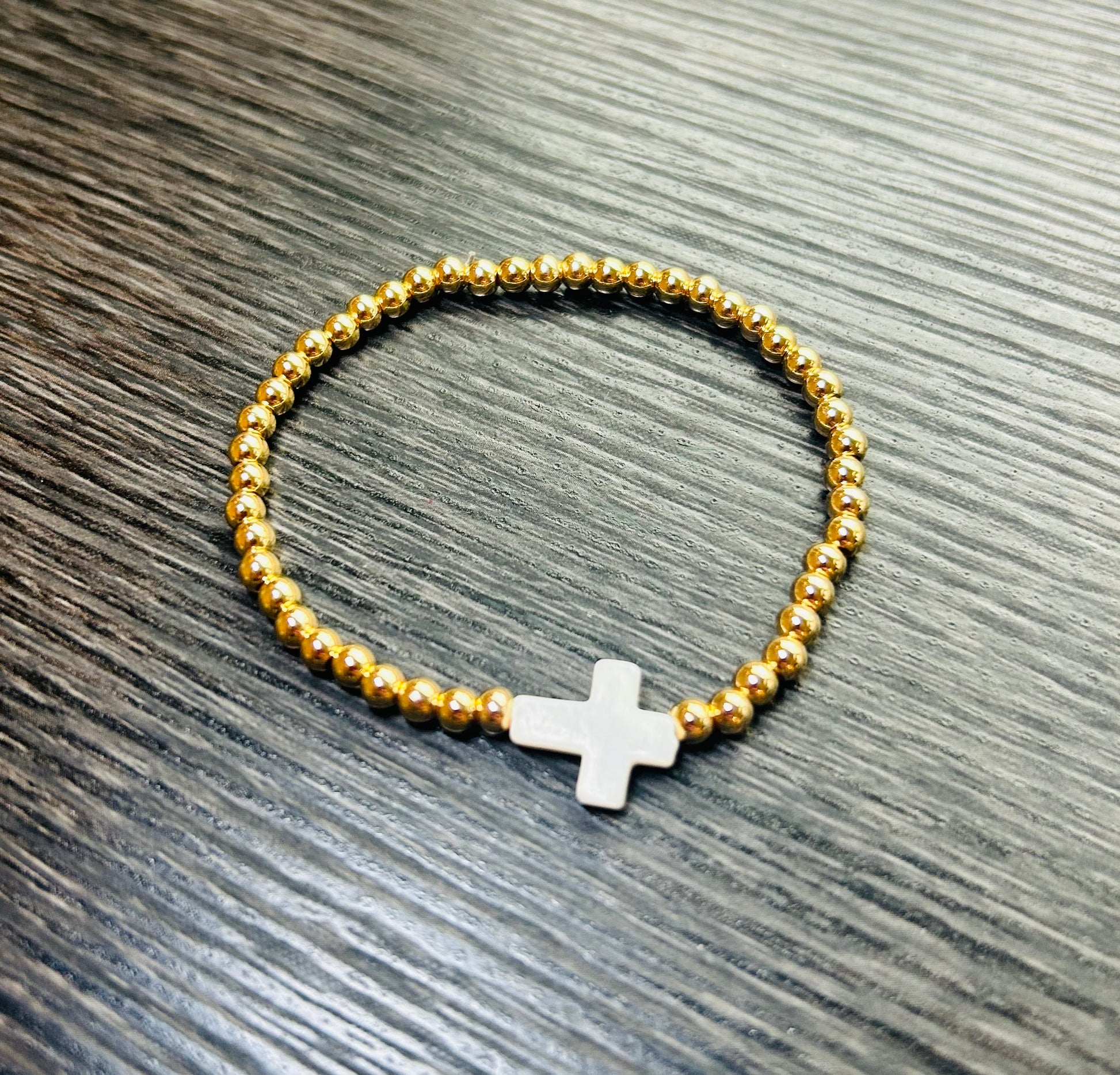 This bracelet blends timeless beauty with quiet strength. Featuring a luminous mother of pearl cross and high-shine gold-plated beads, it’s the perfect everyday reminder of faith and grace.
