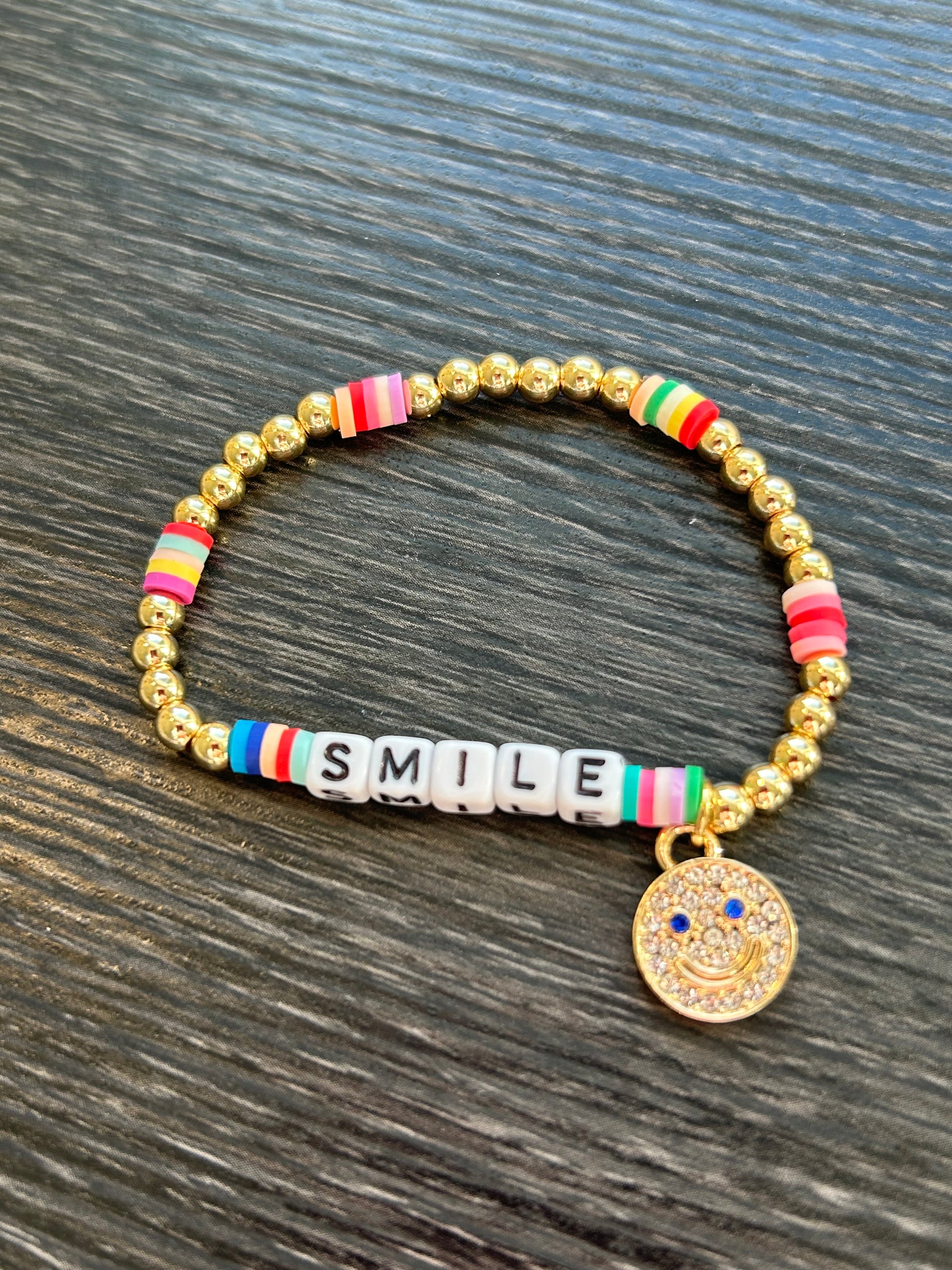 Add a touch of sparkle to your outfit with Sparkly Smile! This colorful, fun gold bead bracelet is perfect for kids who want to show off their style and personality. Let your smile shine with this playful accessory!