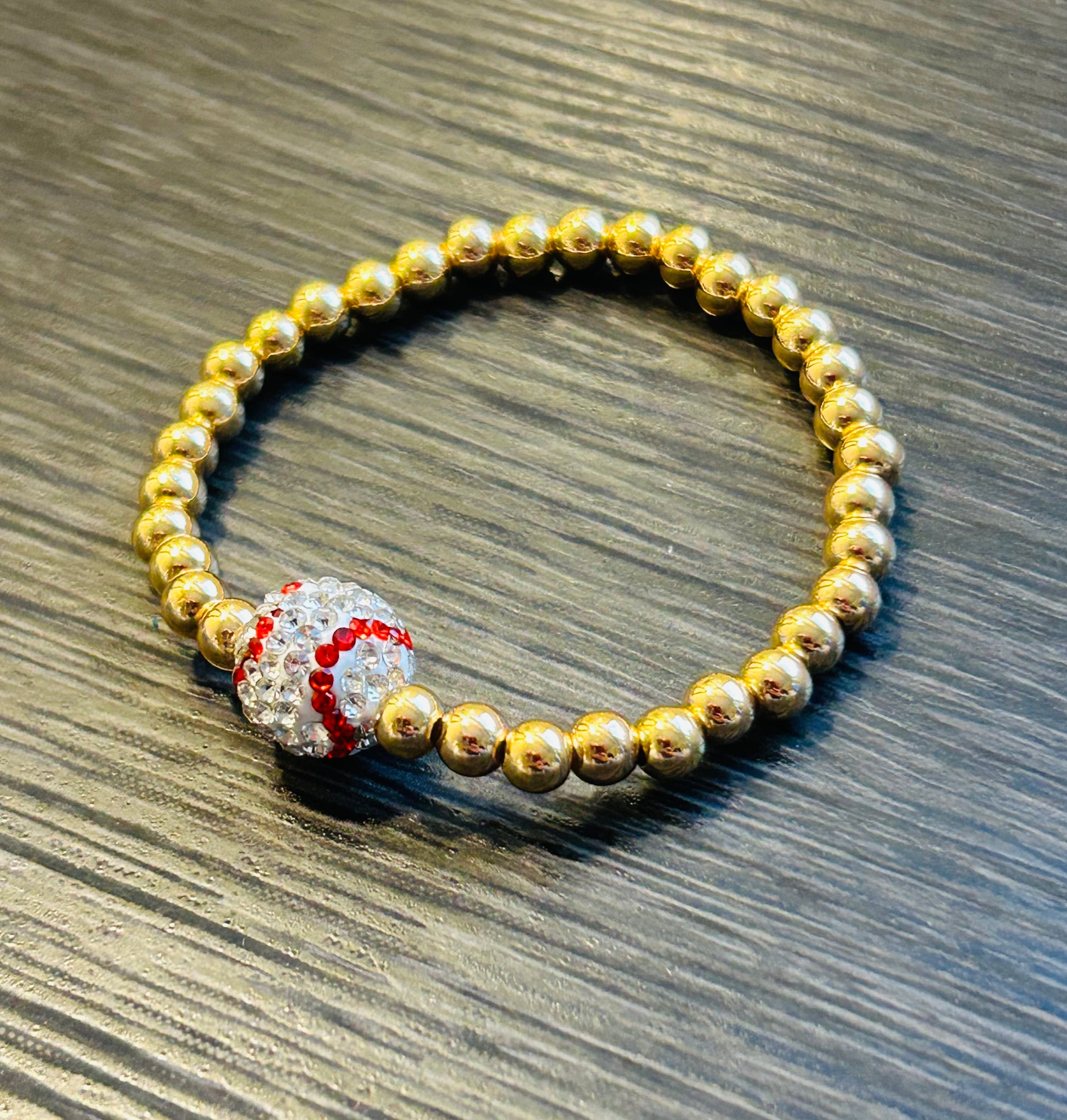 Shiny gold-plated beads meet a sparkling baseball charm for the ultimate sporty-chic accessory. Whether you’re at the ballpark or just showing your love for the game, this bracelet brings the heat.